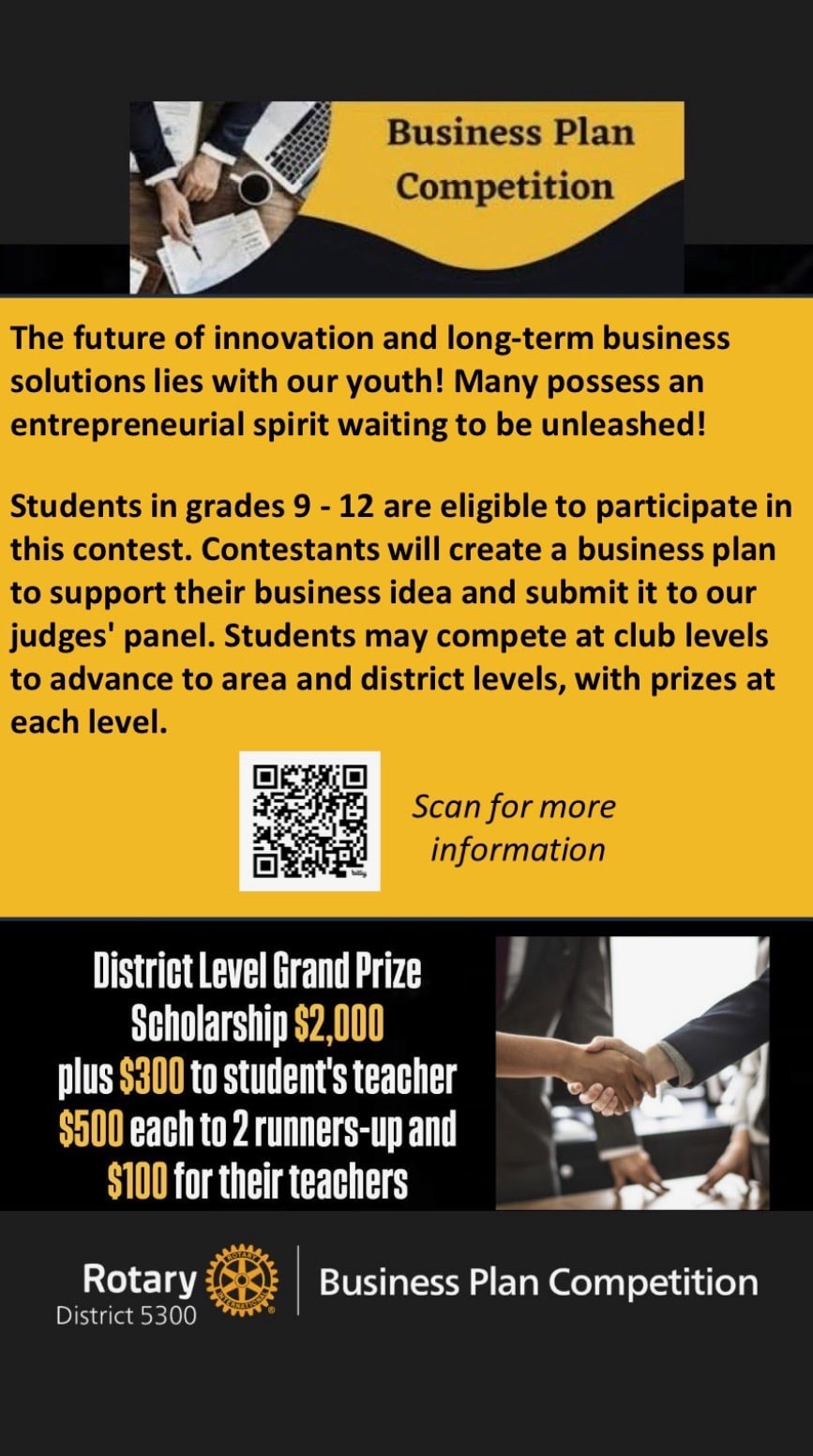 Entrepreneurial literacy is essential for cultivating the next generation of small businesses, job creation, and community growth. Rotarians, with their business expertise and leadership, are uniquely positioned to inspire future entrepreneurs while offering students meaningful scholarship opportunities. This competition aligns with our vocational service mission by giving students a powerful first step on their vocational journey. Additionally, contestants will tie their product or service to its impact on one (or more) of Rotary’s Seven Areas of Focus (see Rotary's Seven Areas of Focus document).