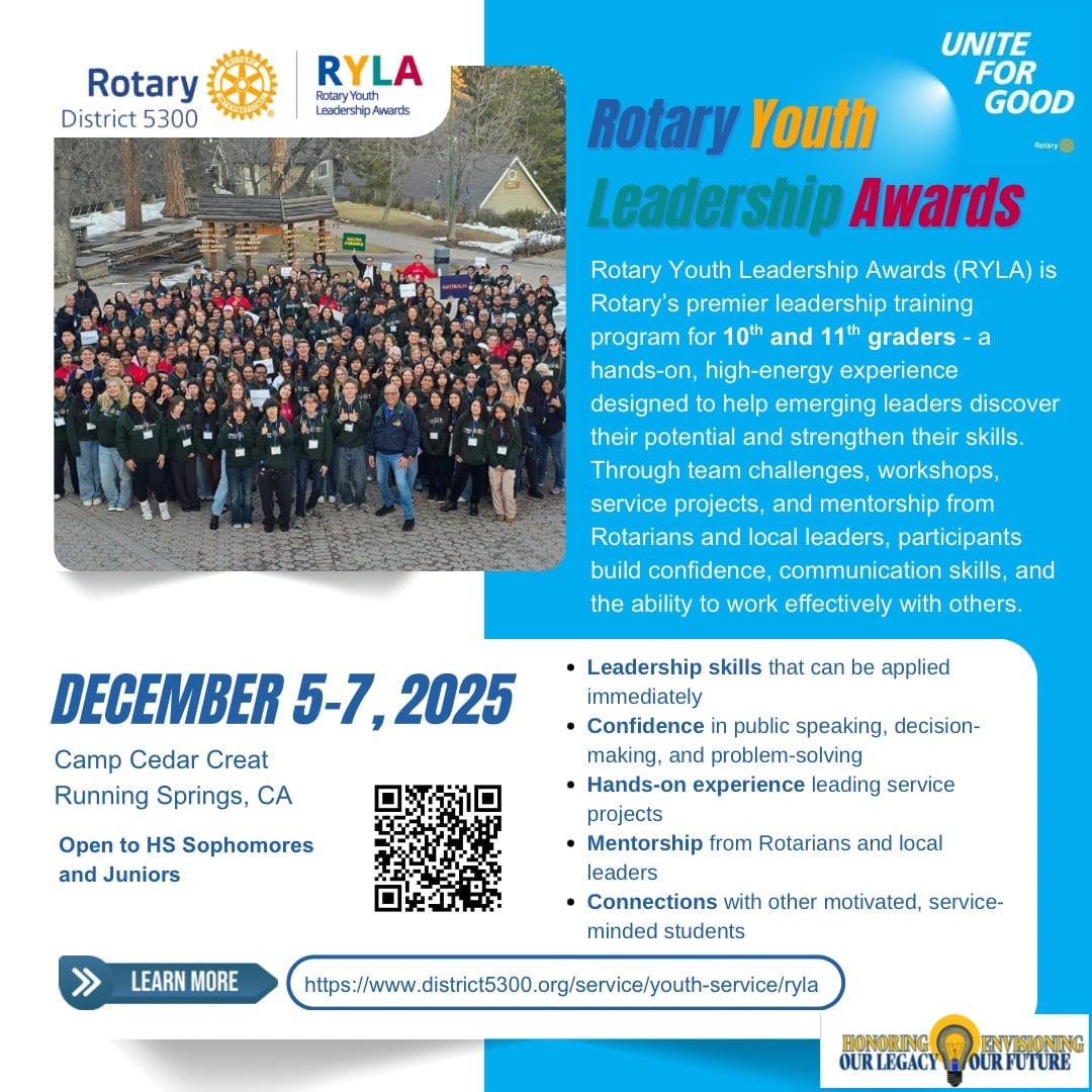 Rotary Youth Leadership Awards (RYLA) is an intensive, two-and-a-half-day leadership training program for high school juniors in District 5300.